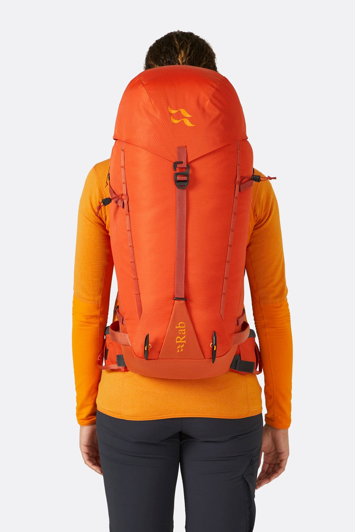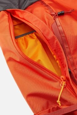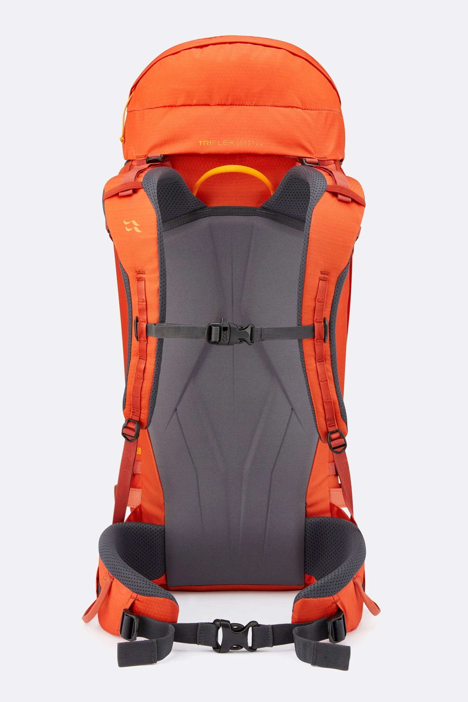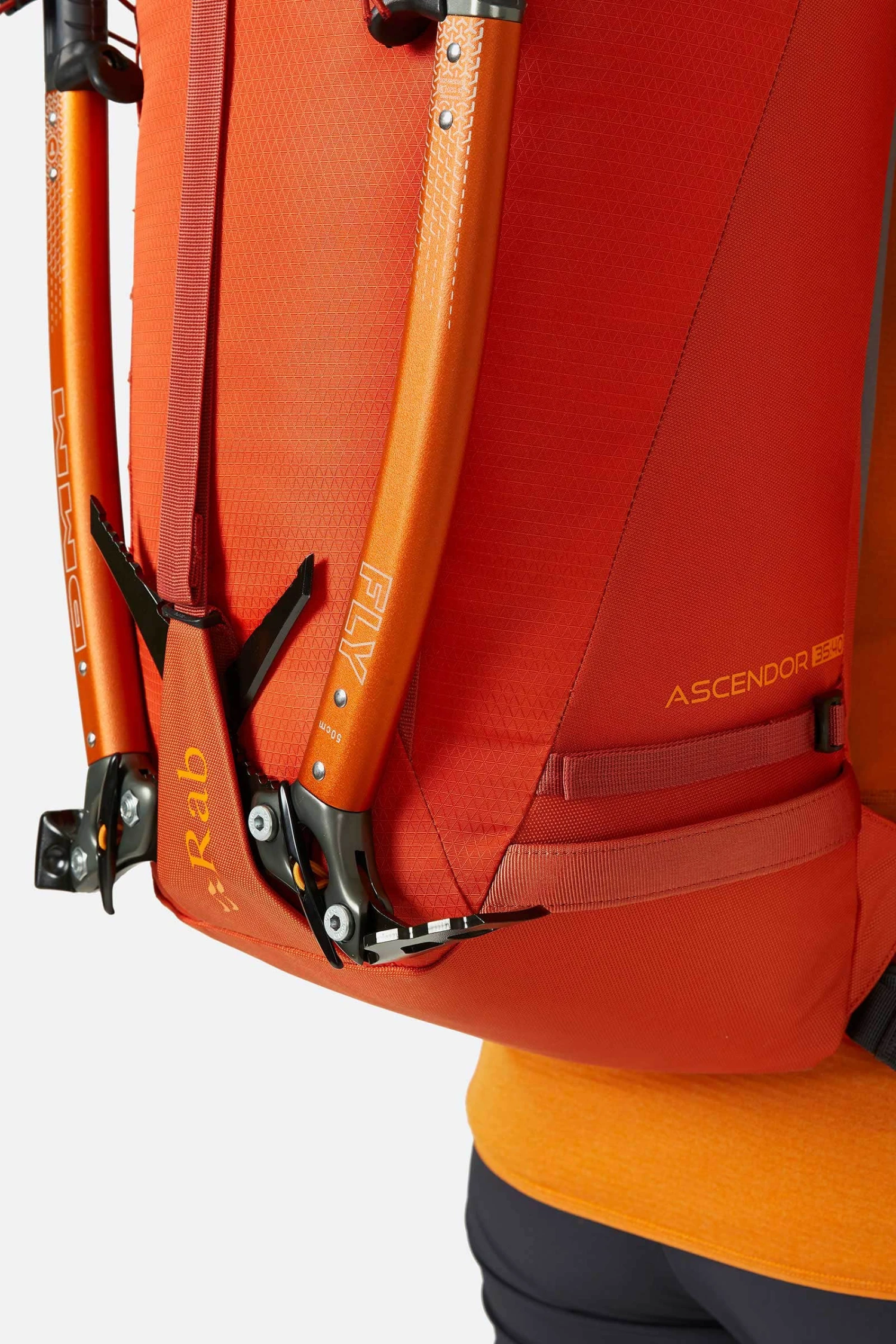 Close-fitting and designed to allow you to move freely over demanding terrain, the Ascendor 35:40 has a snow shedding, moulded back panel and side compression straps to cinch your gear secure. Easy to open and secure shut with a strong metal hook or remove the top lid completely on lighter weight days and fasten with the large compression flap. This is designed to pull the pack weight close towards your body to greatly improve the carry. It also doubles as a rope strap and protects your gear at the top of the pack from the weather when the lid is off.