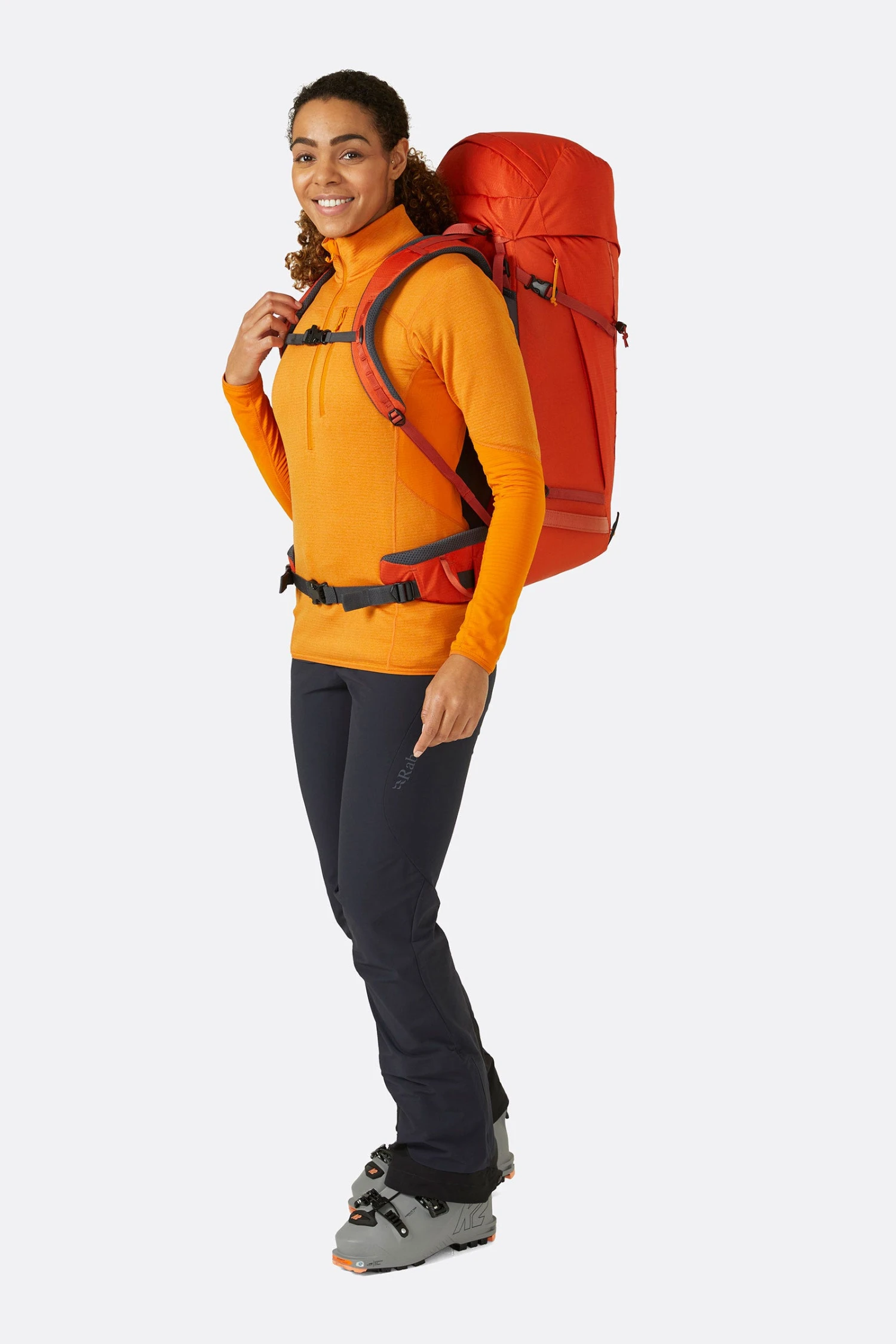 In the middle of the Ascendor range the Ascendor 35:40 is ideal for fully loaded days or routes that involve an overnight bivi. It’s a lidded pack with zipped side entry for quick access to kit and dedicated lower ski loops for carrying skis in an A-frame. It’s built with tough, 50% recycled fabric around the sides and base for optimum abrasion resistance, and a strong yet lighter weight, 35% recycled fabric elsewhere to keep the weight to a minimum. Abrasion, tear, and water resistant, this rugged pack copes with all conditions.