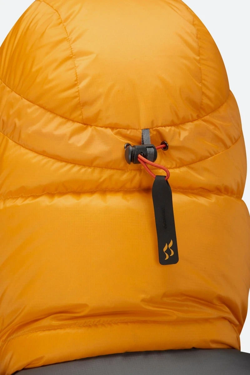 A downproof Pertex® Quantum lining and boxwall baffle construction with differential cut maximise loft to improve heat retention. The down extends into a helmet compatible hood, which has a wired peak and adjustable fit to keep the heat in and the weather out.