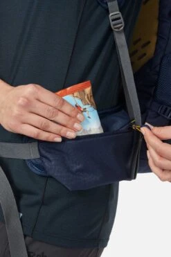 The pack is compatible with a 3L water bladder and features two stretch mesh water bottle side pockets, so you can stay hydrated when the sun’s beating down. There’s plenty of secure storage, including zipped hipbelt pockets for keeping snacks close to hand, and a security pocket under the lid for your valuables. The handy front bungee allows you to quickly stash wet gear, and there are attachment points for stowing walking poles. When a downpour is threatening, you can pull out the rain cover for additional weather protection.