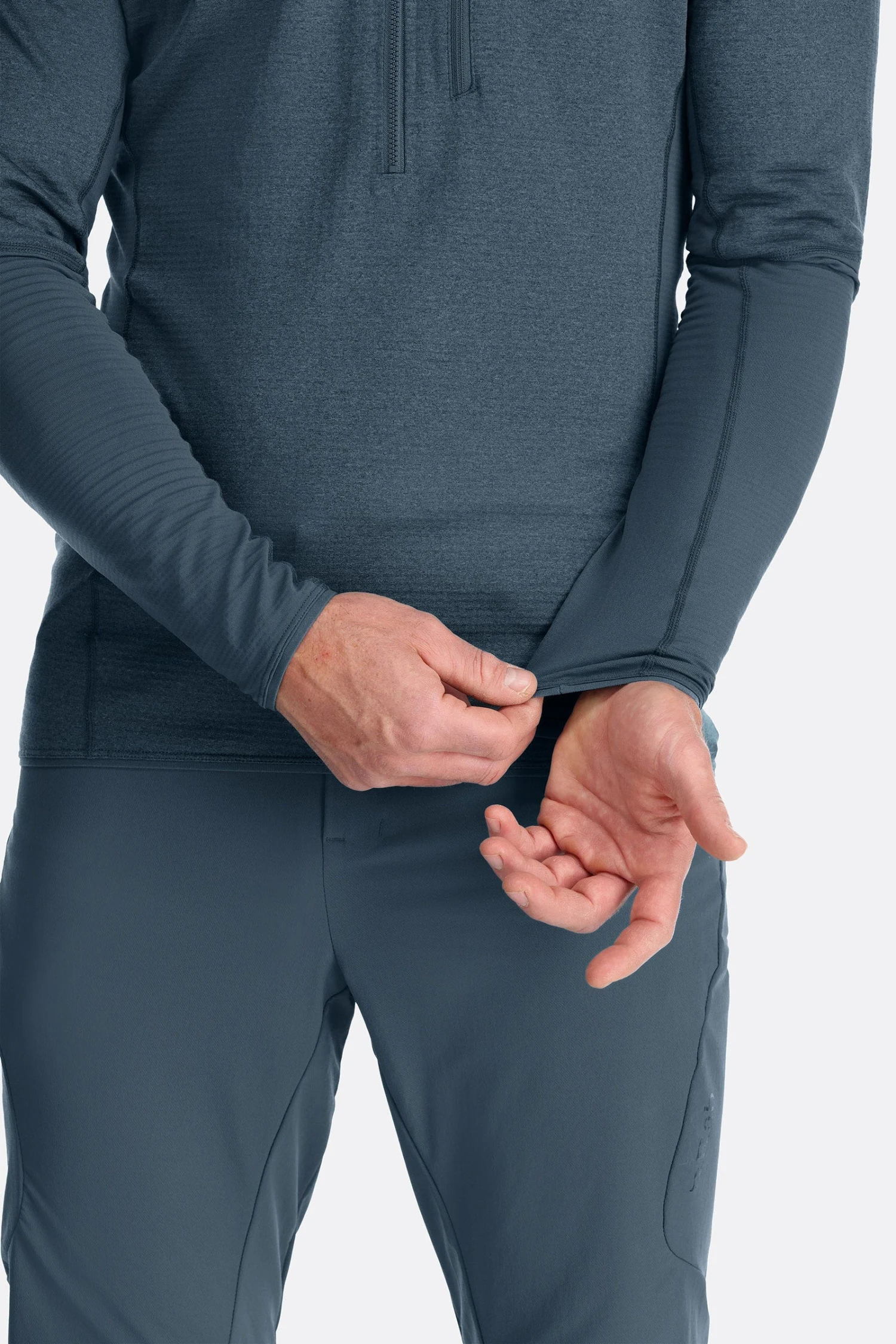 The Ascendor Pull-On’s body mapped construction is designed to adapt more efficiently to your output and the conditions. A midweight, grid backed fleece is zoned to the torso, hips, shoulders, and upper arms and a lighter weight, micro grid backed fleece covers the centre hood, under and lower arms, and centre back. These two fabrics work differently, wicking, breathing, and drying more quickly in the high heat areas. When you’re working hard swinging ice tools, ascending steep slopes, or moving fast, the