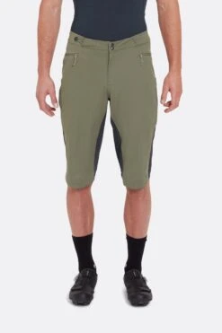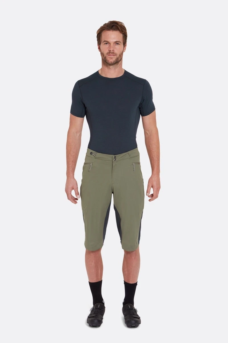 These shorts are designed for miles on the trail, featuring a reinforced seat and inner thigh for extra durability, and a raised centre back with silicone grip for a comfortable on-bike fit. The offset inseams help prevent rubbing, while the integrated shock cord waist adjustment gives you a secure fit for streamlined descents. Two zipped weather-resistant pockets will swallow up your essentials and are easy to access on the go. If you need further storage, the concealed thigh venting zips give access to your Rab cargo short pockets underneath and provide ventilation when you’re grinding uphill.
