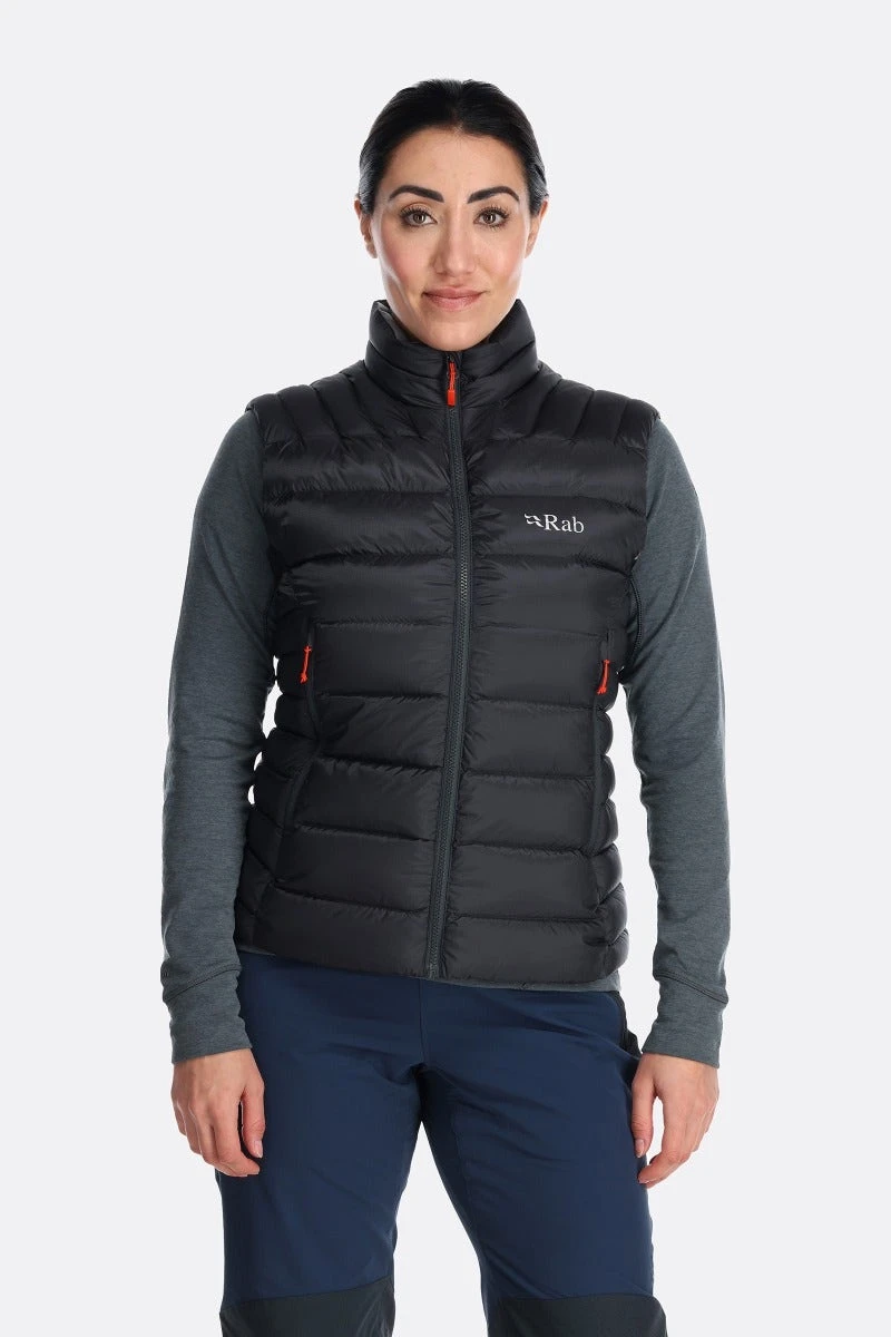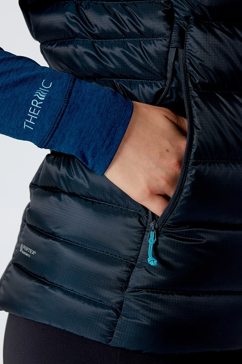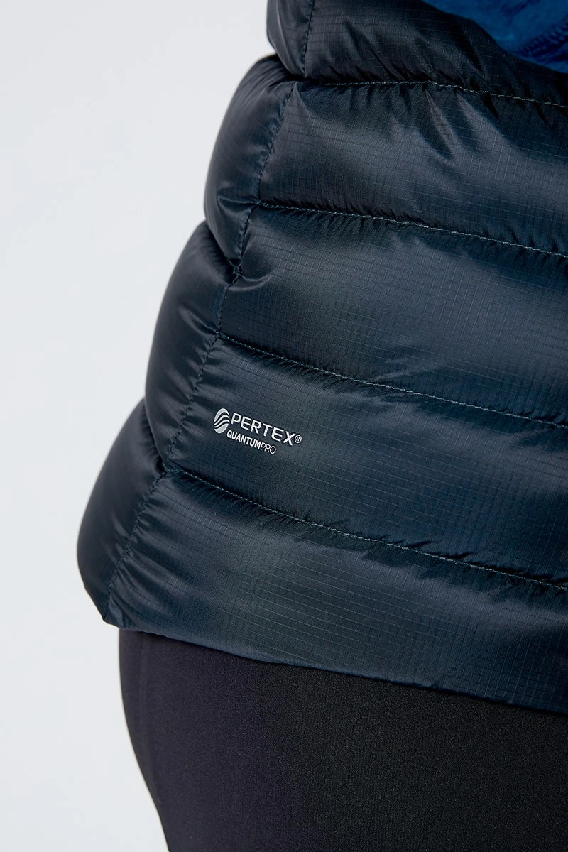 The Women’s Electron Pro Vest is built from 20D Pertex® Quantum Pro ripstop nylon with a DWR coating for improved weather resistance. It uses zoned midi and micro baffle stitch-through construction, alongside 800FP down with a Nikwax® hydrophobic finish, for outstanding core warmth. Practical mountain features include elasticated easy-stretch armholes, an insulated collar, a zipped internal security pocket and an adjustable hem. They also include a pair of harness-friendly zipped hand pockets and a double-ended full-length YKK® Natulon zip. With its advanced fabrics, high-loft down and modest weight, the Women’s Electron Pro Vest packs compact for the easiest possible carry.