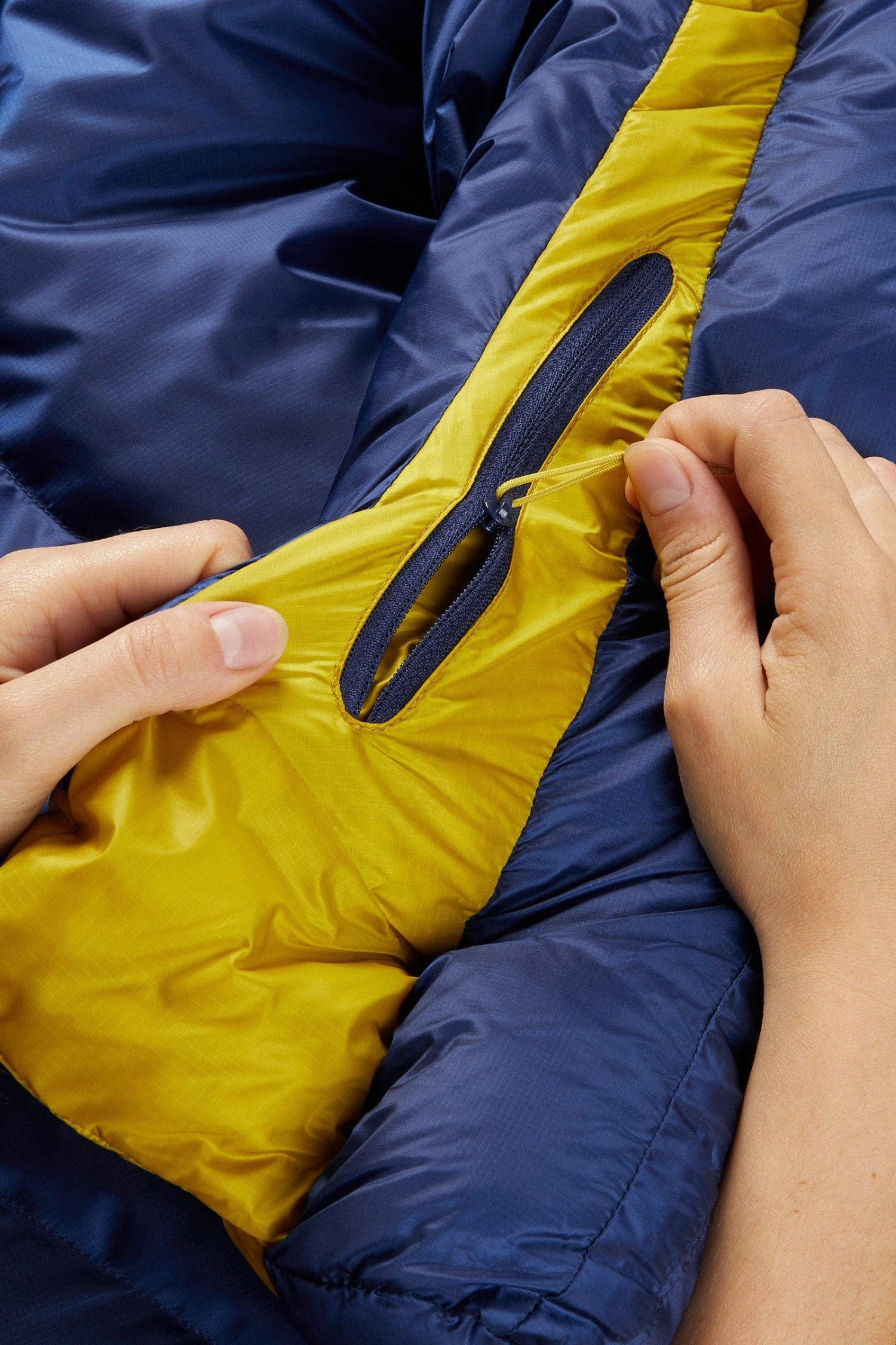 Now built with a recycled nylon lining and recycled Pertex® Quantum outer, it’s wind resistant and a little lighter on the planet too. The down is also finished with a Nikwax, fluorocarbon-free hydrophobic treatment for coping with condensation. It has a ¾ length zip with anti-snag zip guards, a zipped internal stash pocket and comes with a waterproof roll-top compression sack for easy stashing.